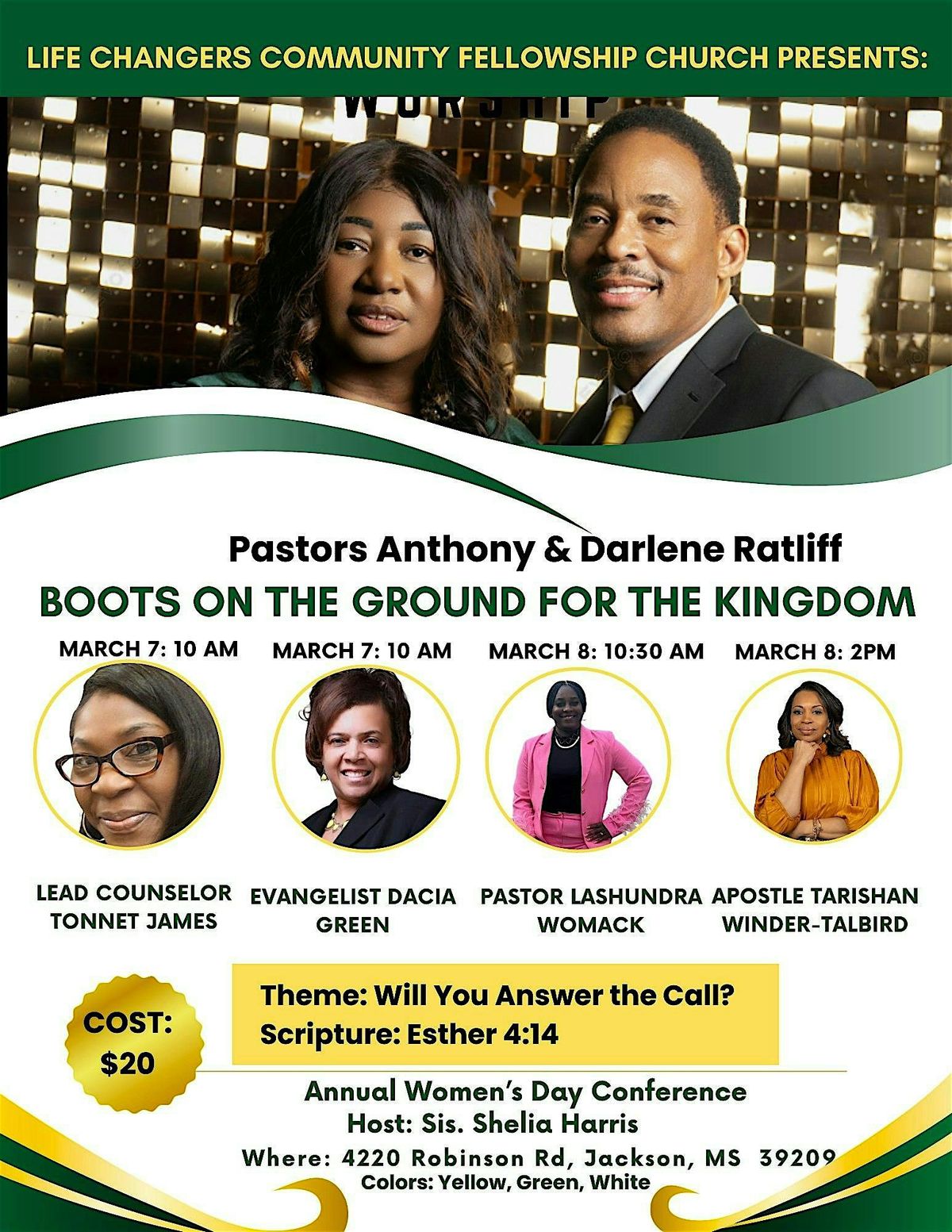Boots on the Ground for the Kingdom is Life Changers Community Felllowship Church's Annual Women’s Day Conference designed to strengthen your faith, deepen your prayer life, and activate you in your Kingdom assignment. Rooted in Esther 4:14, this two-day experience centers on one question: Will you answer the call?