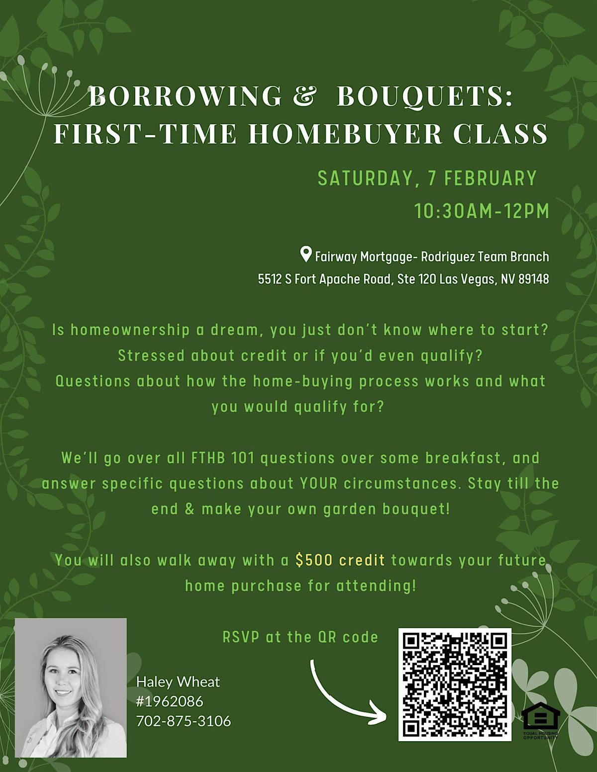 Join the Rodriguez Team, as Michael Rodriguez, the top licenced loan officer in Nevada at Fairway Mortgage, addresses all questions for First-Time Homebuyers (or those seeking a refresher). Breakfast will be provided as well as a complimentary build-your-own bouquet.