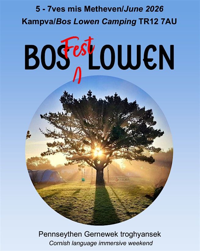 Bos Fest Lowen is a Cornish Language weekend for those interested in improving their spoken Kernewek. Bos Lowen is a beautiful campsite on The Lizard. Tents and camper vans welcome. Some electrical hookups are available.