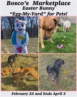 Let Bosco’s Team and the Easter Bunny hop on over and egg your pet’s family, furry friends, or pet-loving neighbors! With colored plastic eggs filled with dog treats.