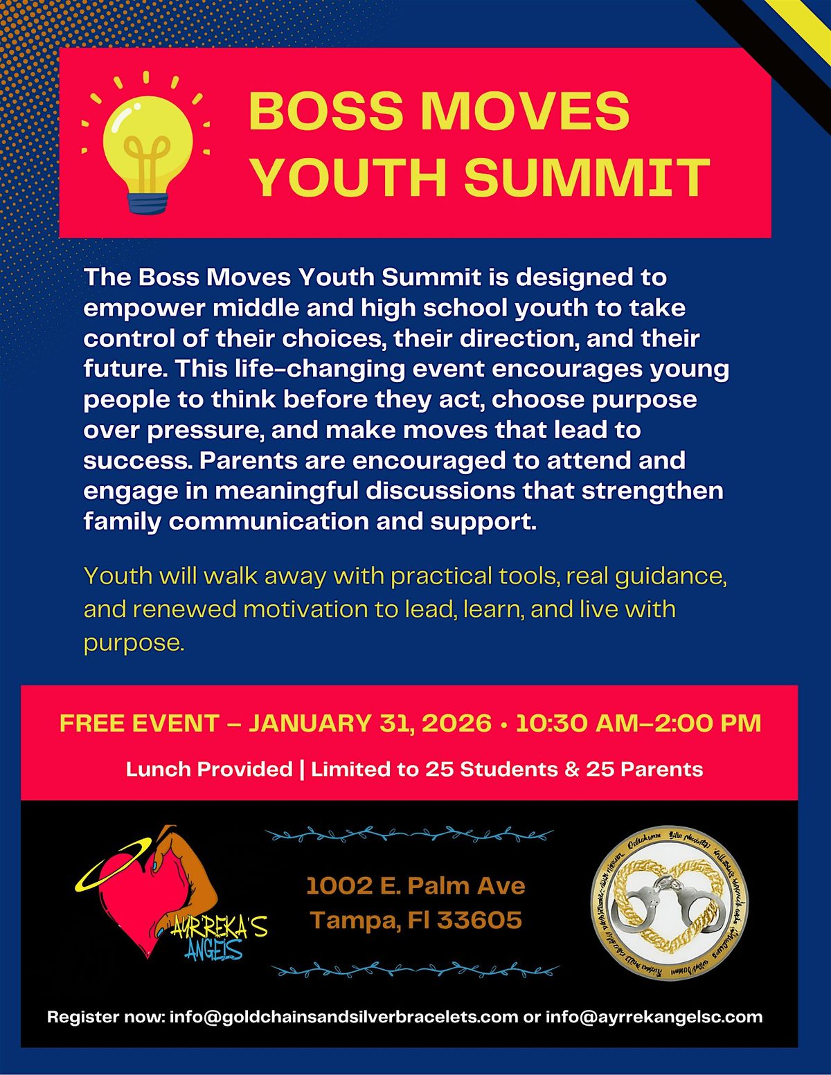 The Boss Up Youth Summit is an empowering and impactful event designed for youth ages 11–17, with parents and guardians encouraged to attend. This summit focuses on helping young people understand the importance of making positive choices, taking accountability, and building a purpose-driven future. Through engaging panels, real-life conversations, and mentorship from community leaders, advocates, and law enforcement partners, participants will explore topics such as peer pressure, decision-making, consequences of choices, leadership, self-worth, and personal growth. The goal is to educate, inspire, and redirect youth toward positive paths—whether they are trying to avoid negative influences or overcome past challenges. This is a judgment-free space focused on guidance, growth, and empowerment. Youth will gain tools, resources, and encouragement to rise above circumstances and choose progress over setbacks. Hosted by Ayr’Reka’s Angels Inc. and Gold Chains and Silver Bracelets Inc., the Boss Up Youth Summit is committed to prevention, education, and community empowerment. ✔️ Open to middle and high school boys and girls ✔️ Parents encouraged to participate ✔️ Limited registration – first come, first served ✔️ Lunch will be provided Boss Up. Choose wisely. Build a future that matters.