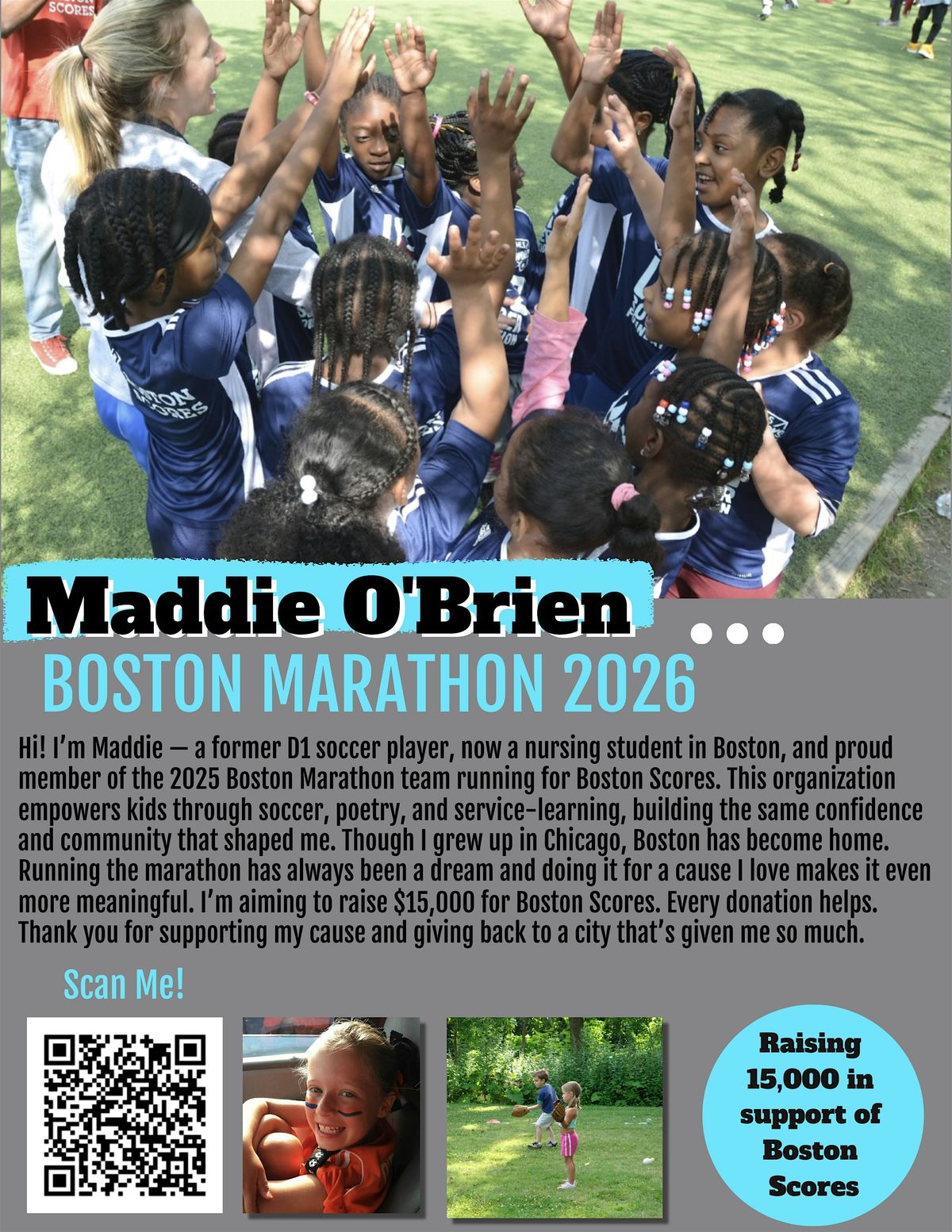 This event supports Boston Scores, a nonprofit that uses soccer, poetry, and mentorship to help Boston youth build confidence, leadership skills, and a love of learning. Funds raised will support their programs as Maddie runs the Boston Marathon on behalf of the organization.