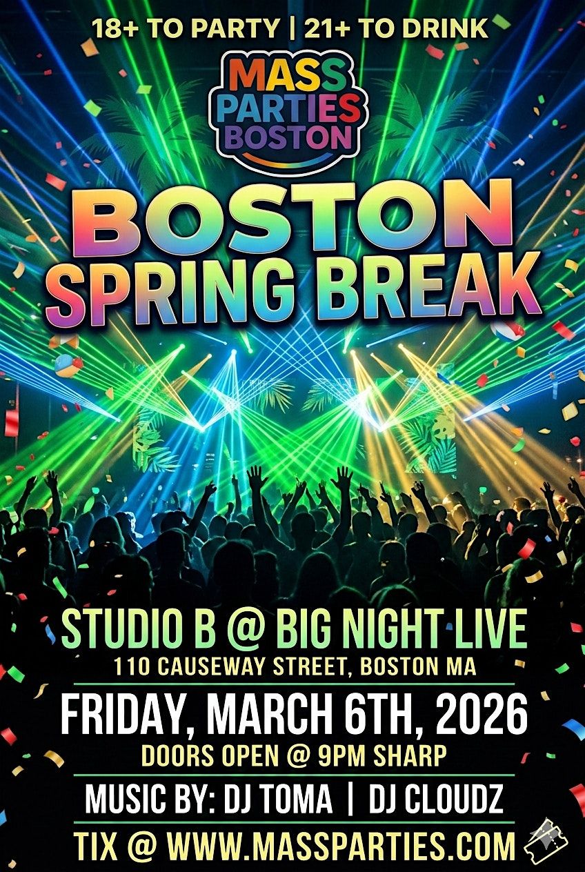 Presented by Mass Parties Boston, this event takes place at Studio B @ Big Night Live, located at 110 Causeway Street, Boston MA. Join the party this Friday, March 6TH, 2026, with doors opening @ 9PM Sharp. Featuring music by: DJ Toma | DJ Cloudz.