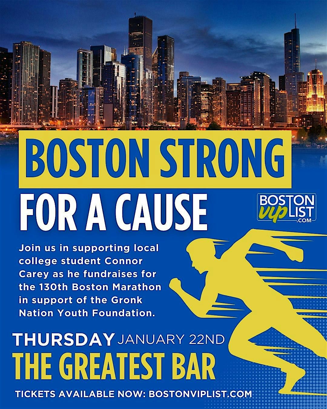 Boston, letβs show up. Join us at The Greatest Bar for an electric night in support of local college student Connor Carey, fundraising for the 130th Boston Marathon benefiting the Gronk Nation Youth Foundation. Here is the link to Connor's incredible and inspirig story: https://www.givengain.com/project/connor-raising-funds-for-gronk-nation-youth-foundation-115512