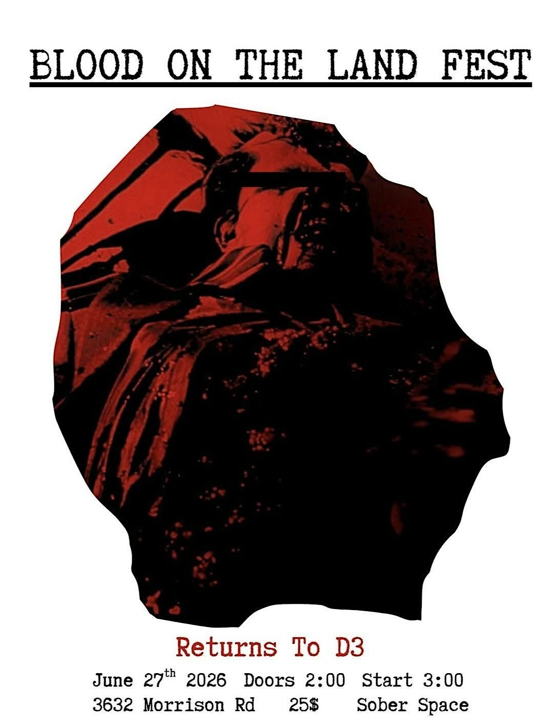 BOTL Booking Presents: Blood On The Land Fest. June 27th. Doors 2pm, music 3pm. 3632 Morrison Rd. $25