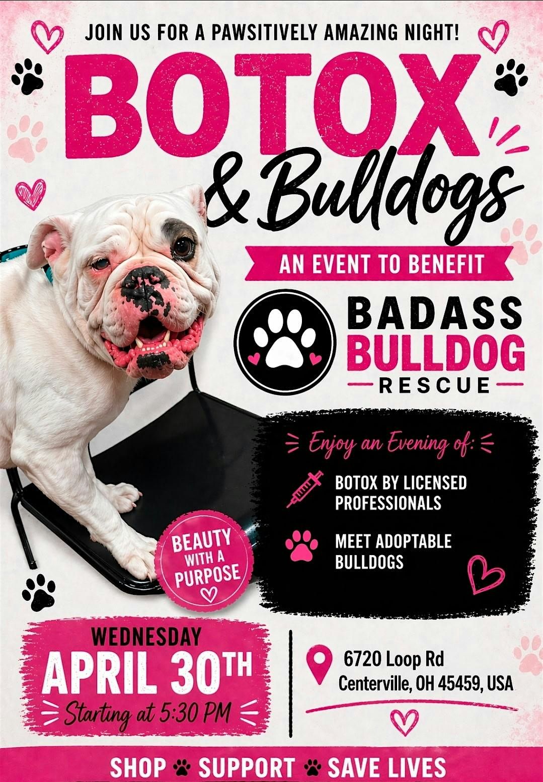 Join us for an evening of bubbles, Botox, and some ultra snuggly adoptable BULLDOGS! Appointment info below!