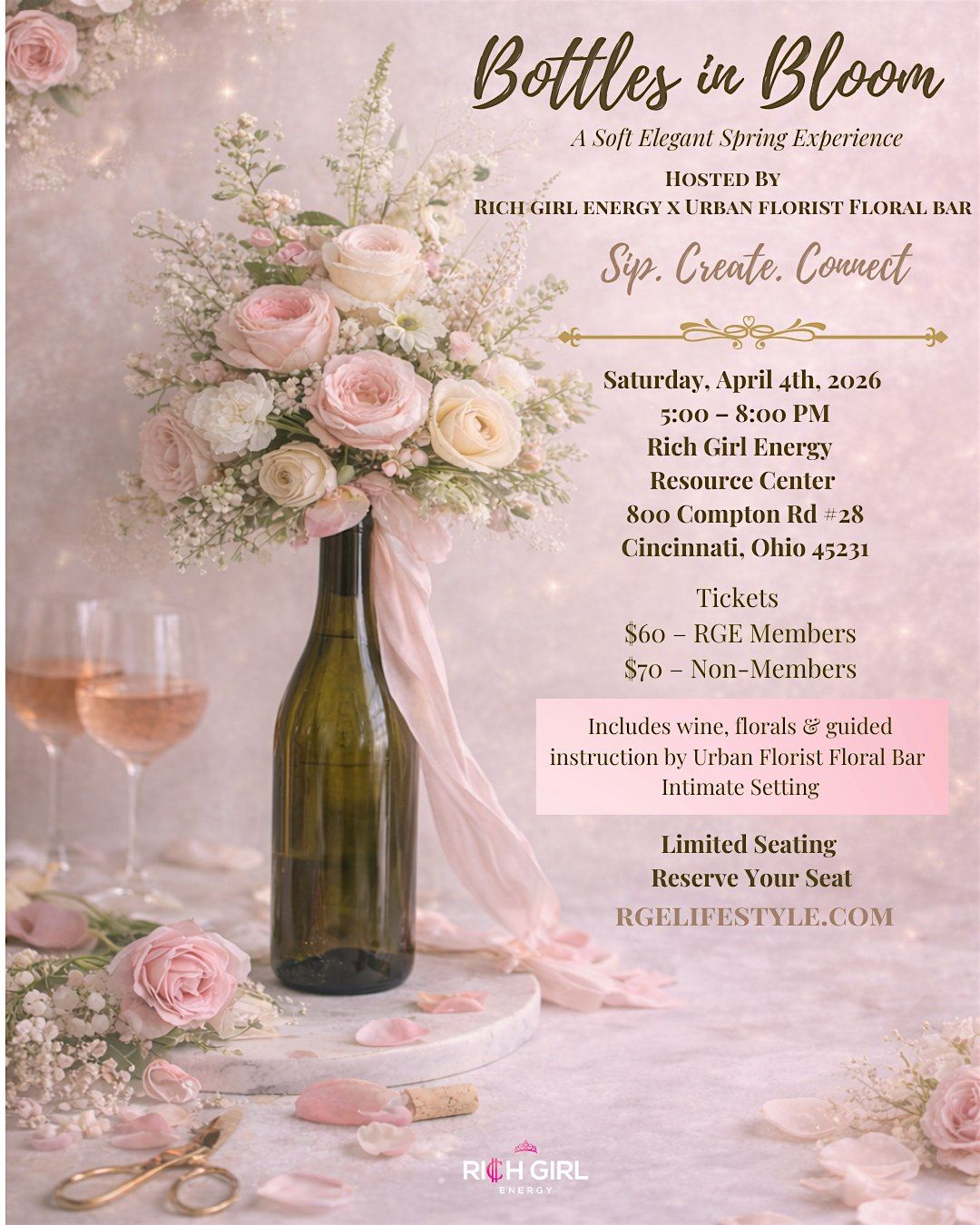 A Soft Elegant Spring ExperienceHOSTED BY RICH GIRL ENERGY X URBAN FLORIST FLORAL BAR ! Includes wine, florals & guided instruction.