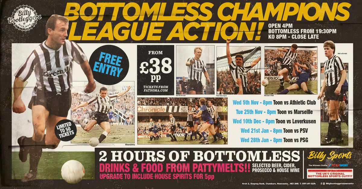What's better than watching Newcastle play in the Champions League?.....That's right, having Bottomless drinks whilst watching Newcastle play in the Champions League.From The UK's Original Bottomless Sports Outfit - Billy Bootleggers.