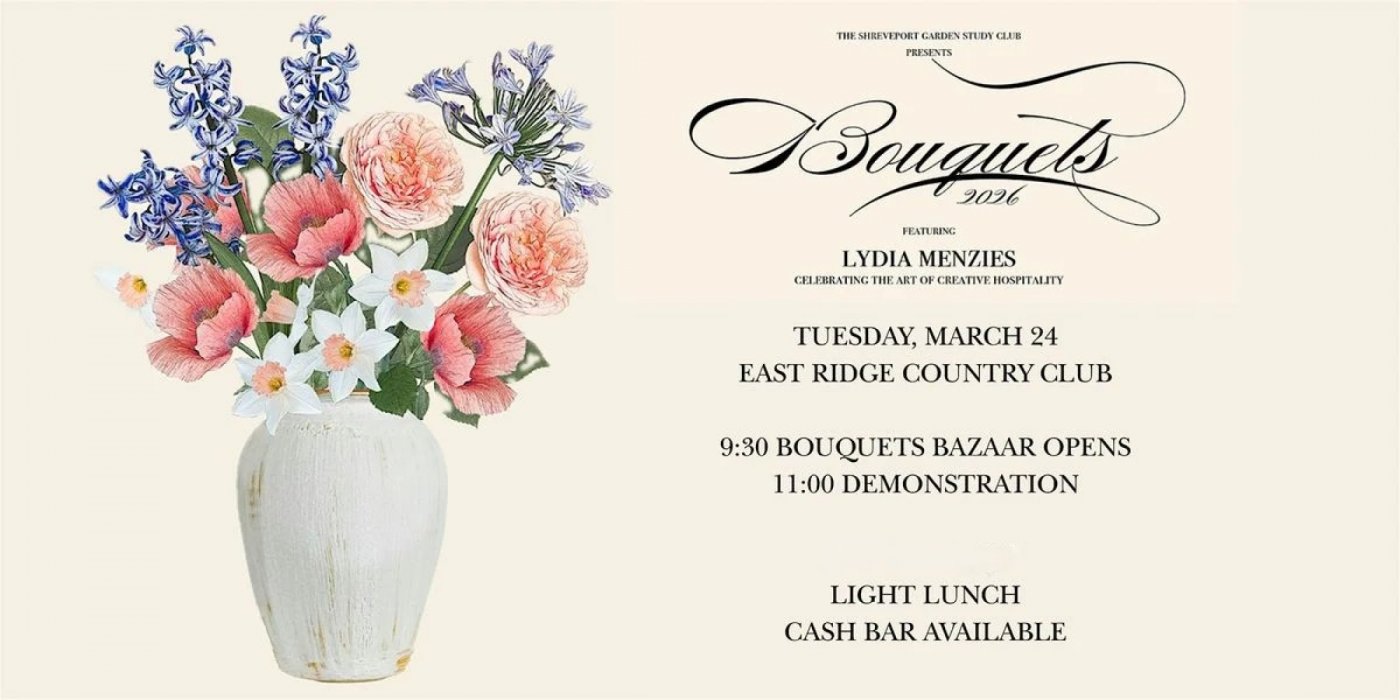 The Shreveport Garden Study Club is thrilled to announce the return of its premier biennial event! Join us at the East Ridge Country Club for Bouquets 2026, an inspiring celebration designed for those who find joy in the garden, beauty in floral design, and the art of gracious hospitality.