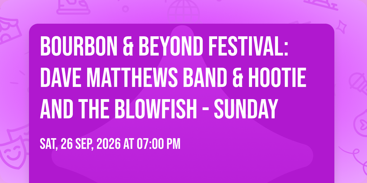 ✨ Enter a world of endless possibilities at Bourbon & Beyond Festival: Dave Matthews Band & Hootie and The Blowfish - Sunday, where every moment tells a story! 🏛️ The stunning Highland Festival Grounds at Kentucky Expo Center in vibrant Louisville, KY transforms into a realm of wonder on September 26th, 2026 at 07:00 PM. 🌟 They have crafted an experience that goes beyond the ordinary, combining elements of surprise, delight, and pure entertainment. Every detail has been thoughtfully considered to ensure your journey with us is nothing short of extraordinary. 🎯 Join fellow adventure seekers and memory makers in this celebration of imagination and innovation. 🎊 Reserve your spot today and be part of something truly special!http://maps.seatics.com/GeneralAdmissionEvent_VIP-GA_2019-01-17_2019-01-17_1339_SVGC_tn.gif