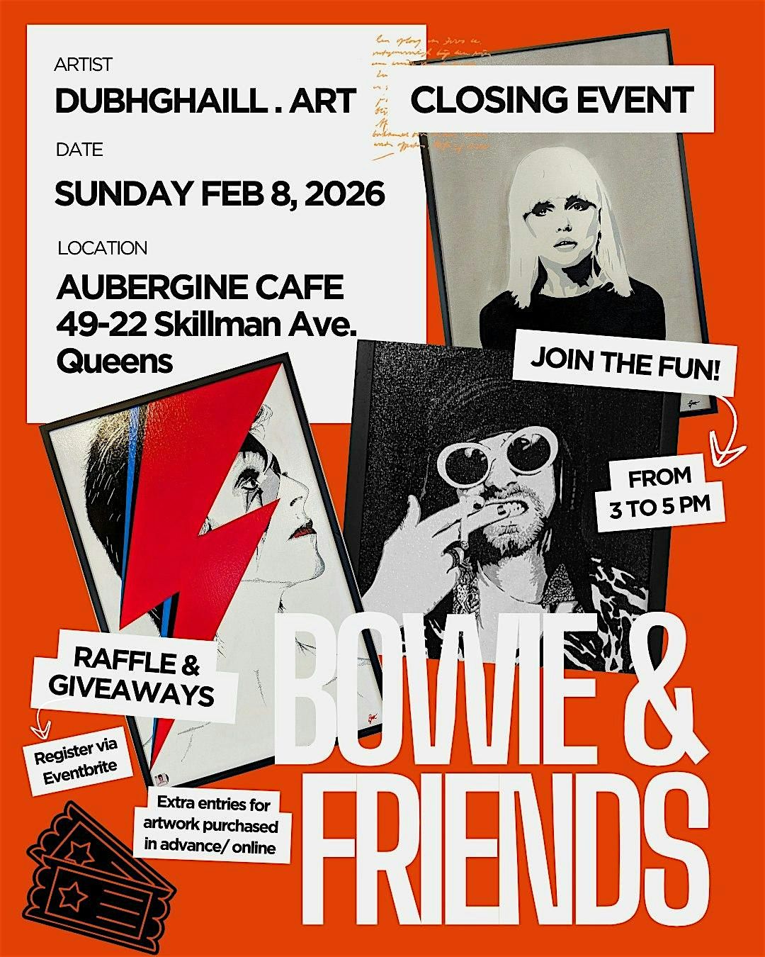 Hosted at Aubergine Café, a long-standing Queens institution known for its strong community ties, the closing night underscores the exhibition’s local roots while honoring Bowie’s legacy as a constantly evolving creative force. Designed as both a final viewing and a moment of gathering, the event invites longtime Bowie admirers, collectors, and neighbors alike to take part in the exhibition’s final chapter.