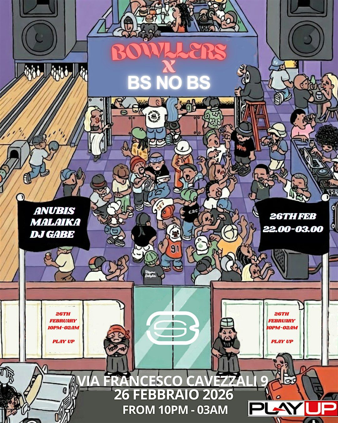 Dimentica il solito locale: il 26 febbraio Bowllers e BS NO BS occupano il Play Up. Spegniamo le luci al neon standard e accendiamo l'impianto.