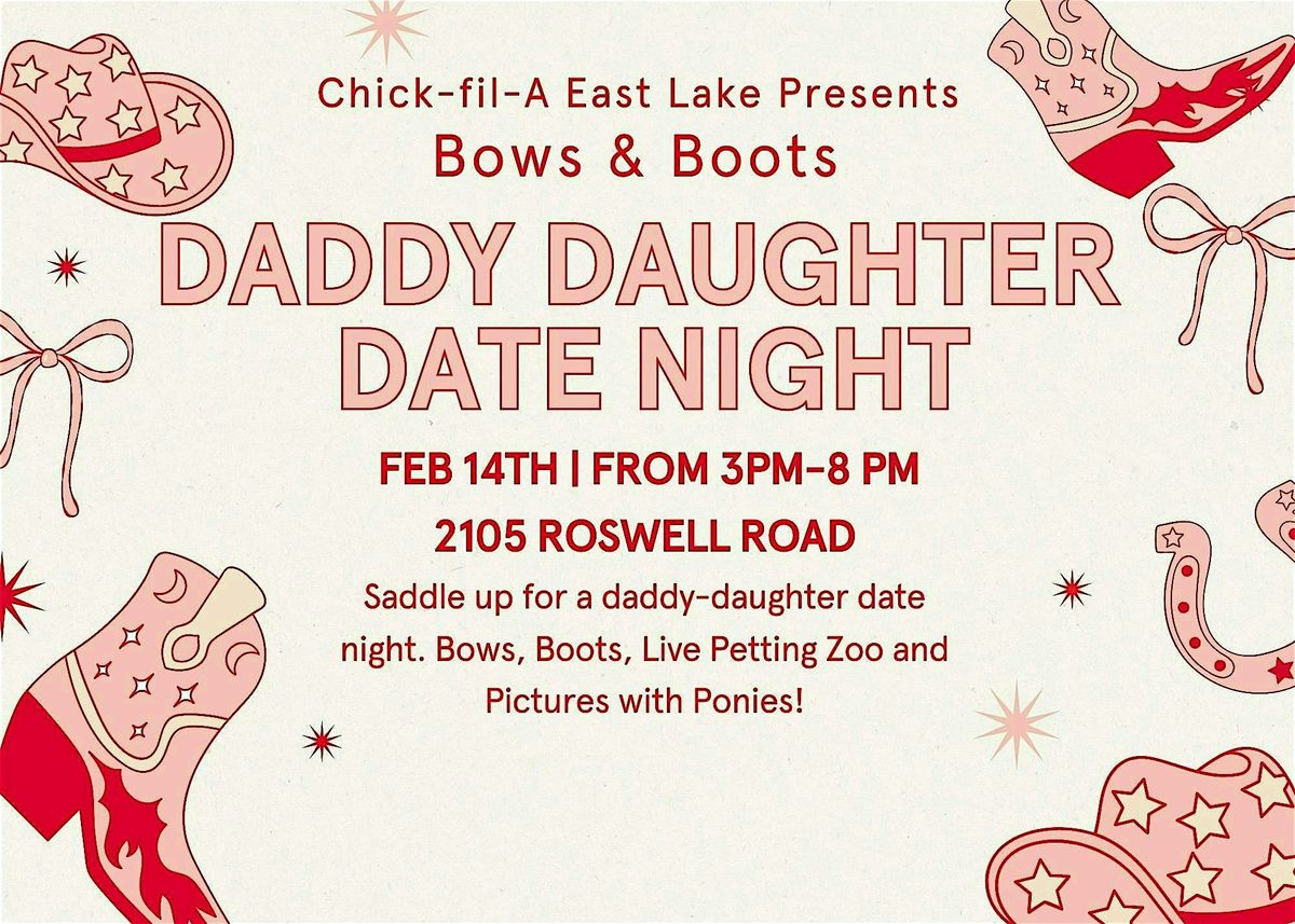 Saddle up for an unforgettable evening at Chick-fil-A East Lake! Join us as we transform our restaurant into a western wonderland for a special Boots & Bows Daddy-Daughter Date Night.