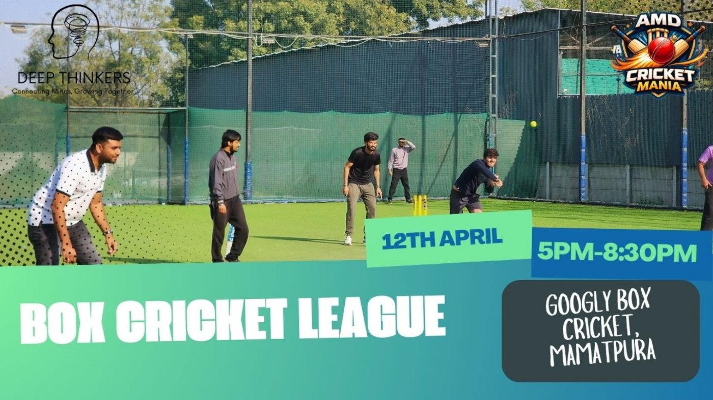 Get ready for an evening of high-energy cricket, competition, and pure sporting excitement! Ahmedabad Cricket Mania, presented by Deep Thinkers, is bringing together cricket lovers for an electrifying box cricket showdown where passion for the game meets friendly rivalry. Whether you're a seasoned player or someone who simply loves the thrill of cricket, this event is designed to give you the perfect mix of competition, fun, and community spirit.
