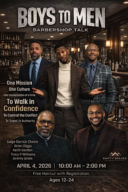 Come hang out in person for some real talk and good vibes at the BOYS TO MEN Barbershop Conversations. It's all about sharing stories, building connections, and lifting each other up. Whether you're looking to listen, learn, or just chill with the crew, this event's got you covered. Don’t miss out on this awesome chance to be part of the conversation!