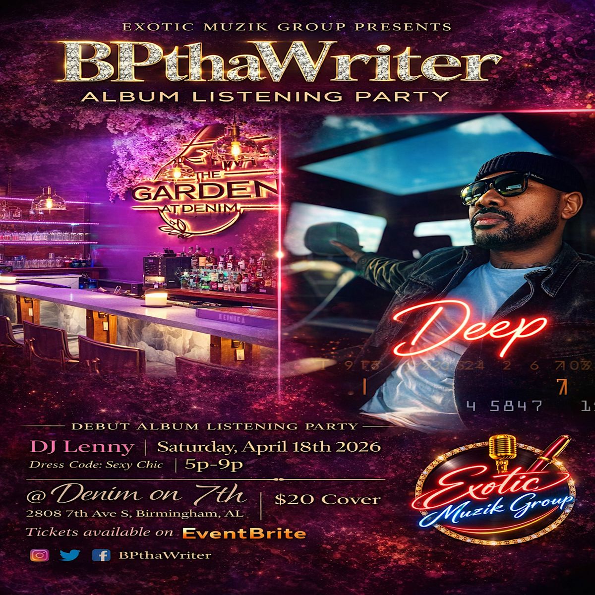 Get ready to vibe with songwriter BPthaWriter as we celebrate the release of his debut R&B album! This in-person event is your chance to hear for the first time, the sound pened and created by Birmigham's very on. The sultry tracks will prove to be a combination of provocative, sexy, thought provoking, and emotional. This is definitely an R&B lovers' groove! Donβt miss out on an unforgettable experience filled with great music, beautiful people, and good vibes. Let's make some memories together!