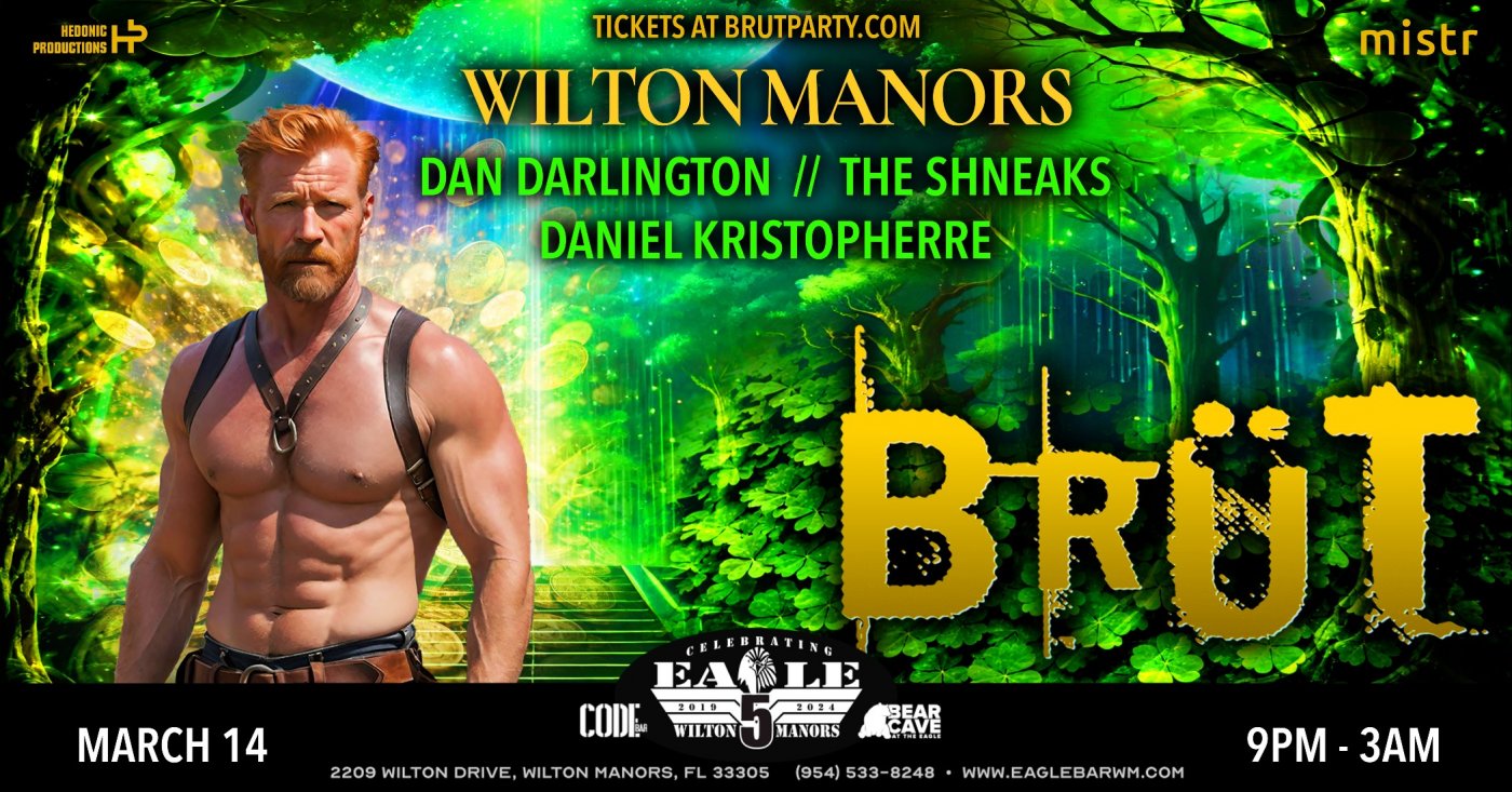 Luck is in the air, and BRÜT returns to Eagle Wilton Manors for the wildest St. Patrick’s weekend in Fort Lauderdale. The ticket pot is guarded by a greedy leprechaun, and only a limited number of golden tickets are available online. This is the time to make your wish come true. Secure your entrance now and don’t leave it to luck at the door.