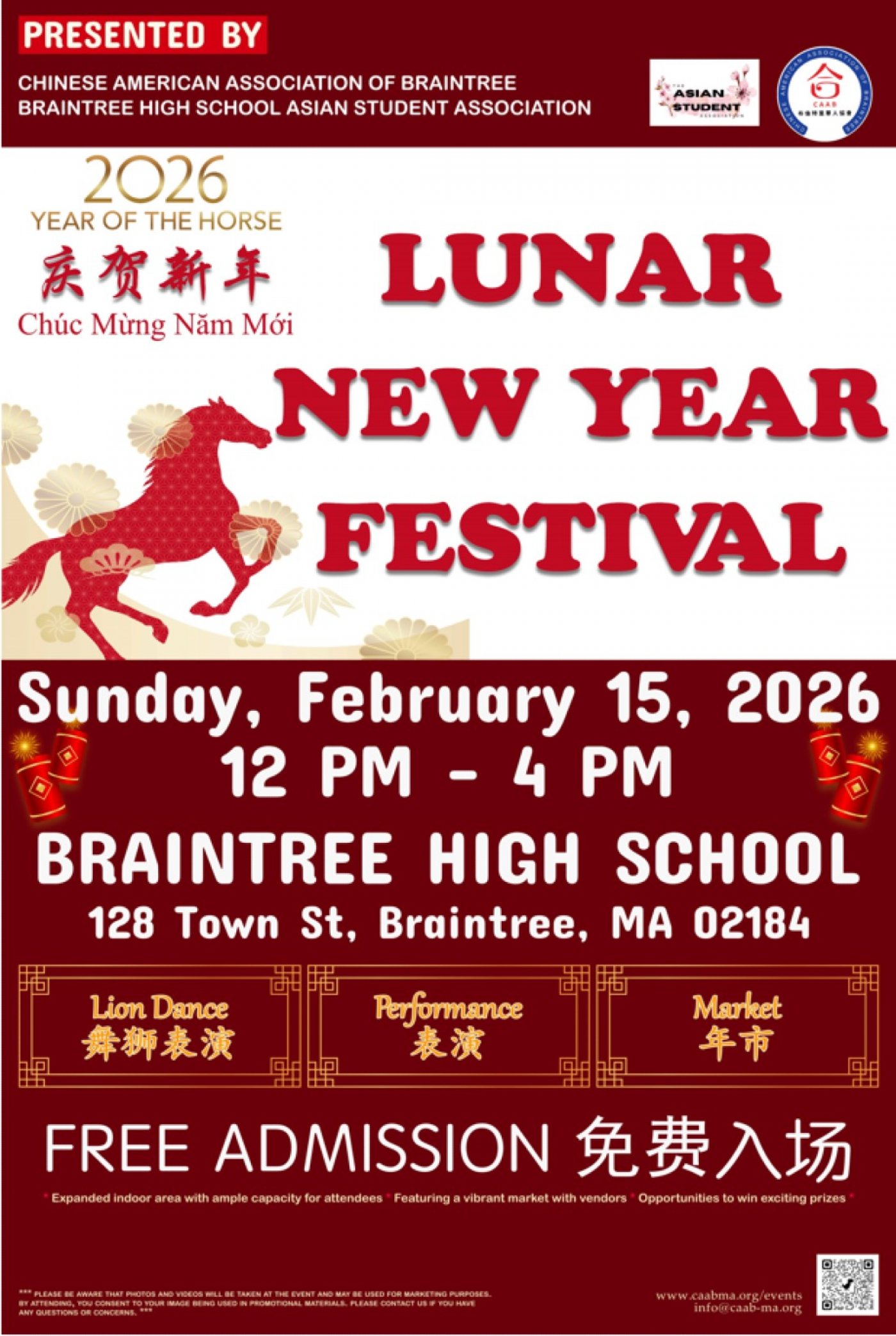 Come join us to celebrate Lunar New Year 2026, Year of Horse . Expanded indoor area with ample capacity for attendees, Featuring vibrant market with local vendors, and Asian food. Event Starts @12:00 PM, lion dance eye dotting ceremony starting @12:30 PM.