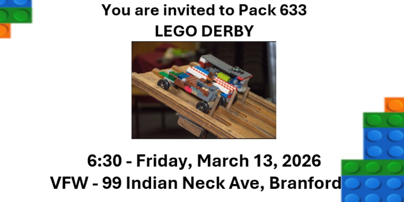 Join us at the Branford Scouting - Pack 633 Lego Derby event on March 13, 2026, at 6:30 PM at the Veterans of Foreign Wars in Branford, CT. Get ready for a thrilling evening of creativity, competition, and camaraderie!
