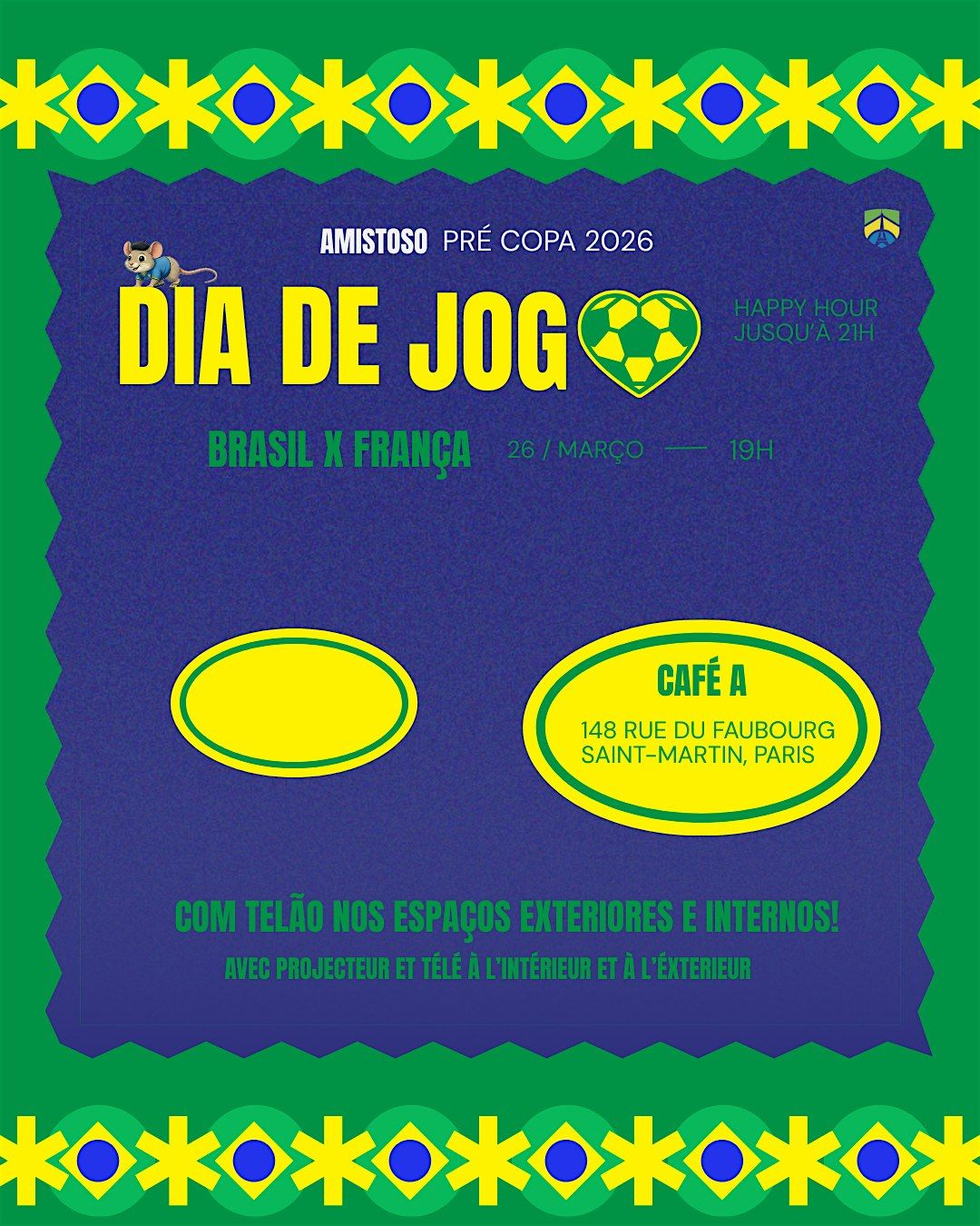 On March 26th, Brazil takes the field against France, and we want to experience this moment together! We'll be showing Brazil vs. France at Café A, with a big screen both inside and outside, in a night full of Brazilian energy 💙💚💛