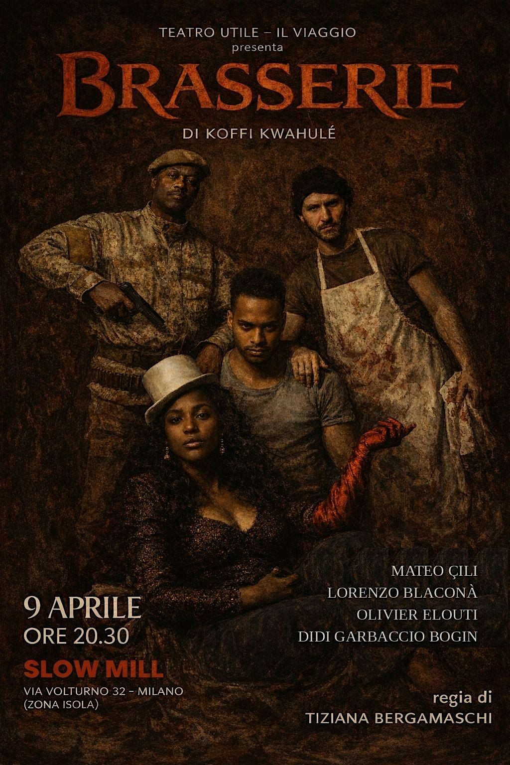 Da qualche parte in Africa, una guerra fratricida ha distrutto tutto il paese. I conquistatori, due clown sanguinari, sono riusciti a prendere il Birrificio (Brasserie) che miracolosamente resiste al massacro. Questa importante fonte di reddito per sostenere il nuovo dittatore, naturalmente più avido di potere che di democrazia, dipende da una donna europea con la quale i due giannizzeri devono giungere a un accordo. Passando dalla violenza omicida dei “liberatori” a una paccottiglia disgustosa di neocolonialismo, attraverso l’appropriazione di soldi pubblici e false promesse politiche, la pièce ci fa entrare con molto sarcasmo e derisione negli orrori della guerra, di ogni guerra, e nel futuro incerto che ne seguirà. Quattro attori, tre uomini e una donna, giocano in scena questa rappresentazione violenta e ridicola della guerra in una trama che rilegge il colonialismo e il post colonialismo in chiave ironica, grazie a uno stile grottesco di grande forza.