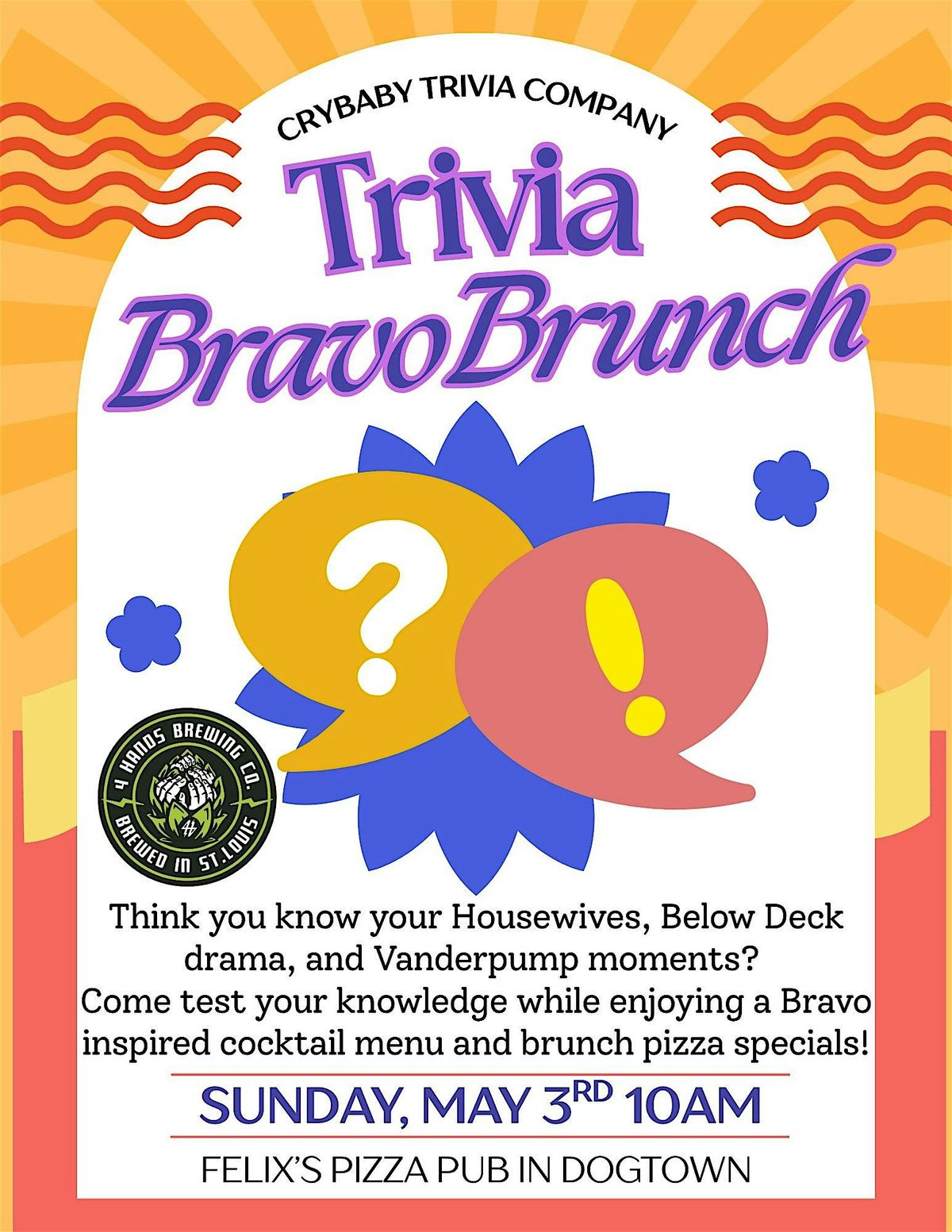 Grab your friends, enjoy some tasty pizza, and put your knowledge to the test with trivia questions that'll challenge and entertain Bravoholics. Costumes and Table Decor are highly encouraged but NOT required. Purchasing a ticket secures your spot in trivia and 1 raffle ticket. Additonal raffle tickets will be available for purchase on the event day.