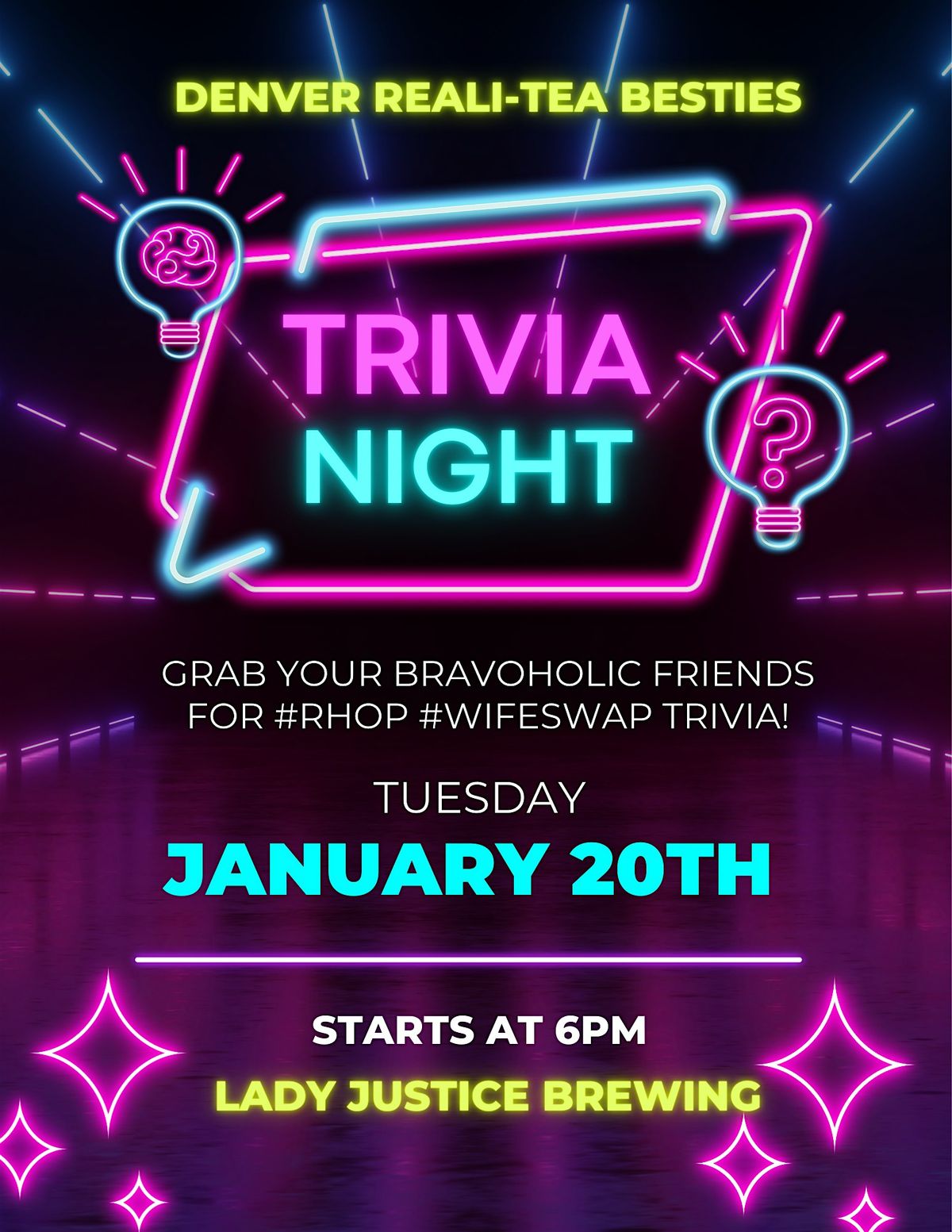 Calling all Bravo Housewives Fans! Are you ready to put your knowledge of drama, shade, and iconic one-liners to the ultimate test? Join us for a fabulous night of Trivia, where you can sip, snack, and spill the tea with fellow reality TV enthusiasts in the Denver metro area!