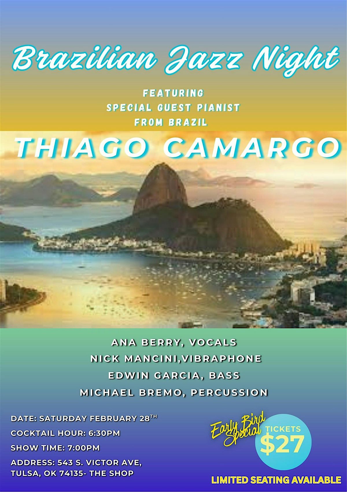 Led by acclaimed Brazilian pianist Thiago Camargo, this special performance blends the rich traditions of samba, bossa nova, and contemporary jazz into a sound that is both vibrant and deeply expressive. With lyrical phrasing and captivating improvisation, Thiago creates a musical journey straight from Brazil to the heart of Tulsa.