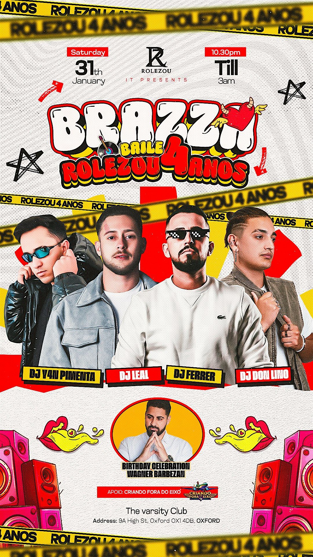 Prepare-se para uma noite incrível celebrando 4 ANOS DE ROLEZOU, com muita música, energia e aquela vibe brasileira que Oxford já conhece! 🇧🇷🔥