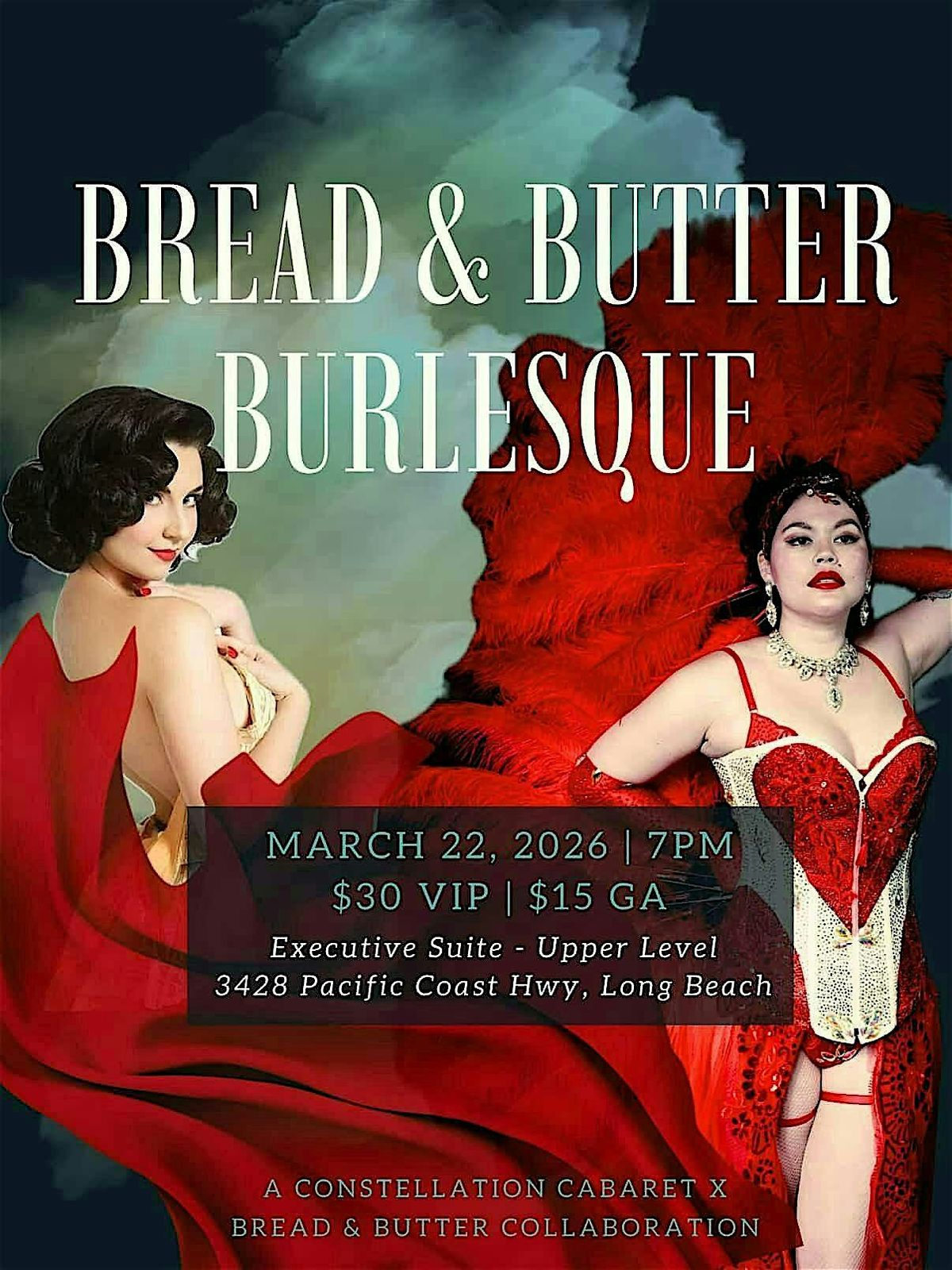Step into an evening where vintage rhythm, elegance, and allure come alive. Bread & Butter Burlesque, co-produced by Constellation Cabaret, is a carefully curated experience blending classic jazz, sensual movement, and timeless sophistication — all wrapped in the warm glow of nostalgia and live music energy.