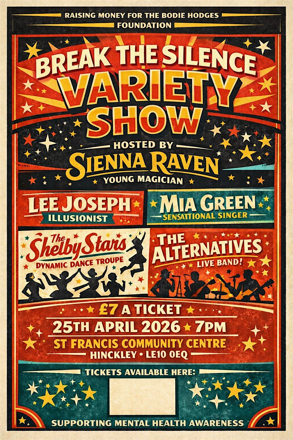 Join us for an unforgettable evening of entertainment with purpose at the Break the Silence Variety Show, a vibrant night of magic, music, dance, and live performance — all in support of mental health awareness and the Bodie Hodges Foundation.