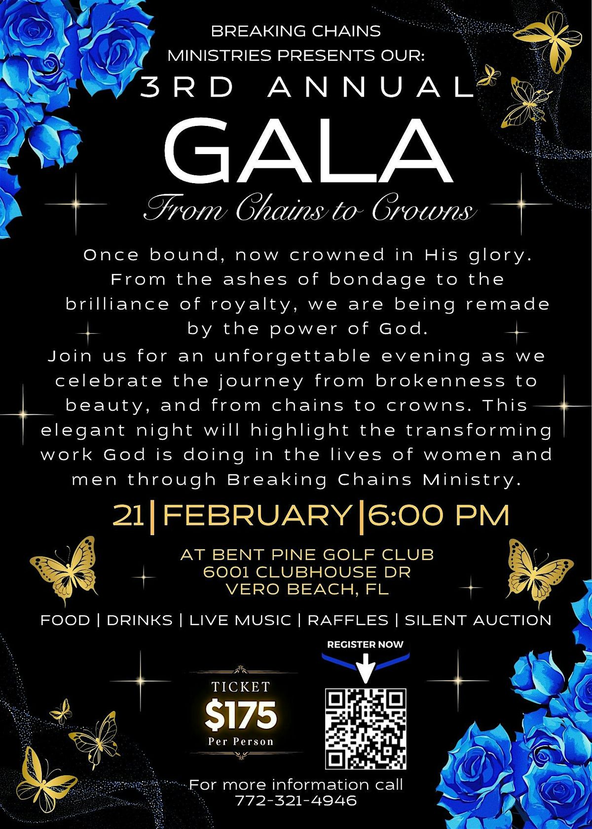 The From Chains to Crowns Gala is a powerful night of beauty, redemption, and becoming—honoring the journey from struggle to strength. Join us for an elegant and inspiring evening featuring dinner, drinks, live music, raffles, and a silent auction, all woven together with meaningful stories of transformation and resilience. This unforgettable night celebrates the courage it takes to rise beyond hardship and step fully into purpose. Whether you come to support the cause, enjoy a beautiful evening out, or be moved by stories that inspire hope and renewal, your presence will make a lasting impact. The gala will take place on Friday, February 21st at 6:00 PM at Bent Pine Golf Club, 6001 Clubhouse Dr, Vero Beach, FL. We look forward to celebrating with you.