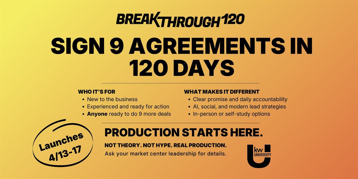 That's not a tagline — that's the promise behind Breakthrough 120, a KWU-certified production program launching at on April 13–17. This isn't theory. It isn't hype. It's a structured, accountability-driven sprint designed to put agreements in your hand — fast.
