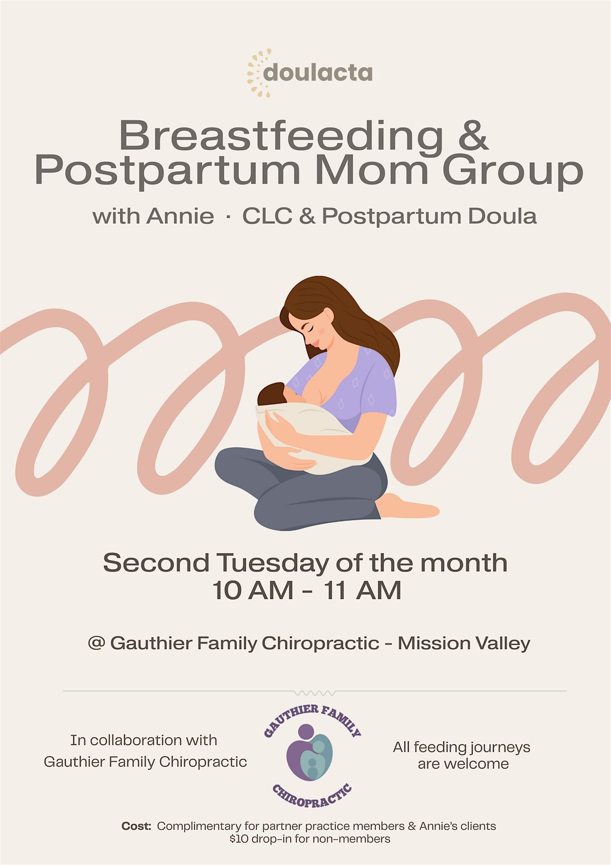 A relaxed, supportive postpartum group for new moms and parents with babies, led by Annie, a certified lactation counselor and certified postpartum doula (and mom).