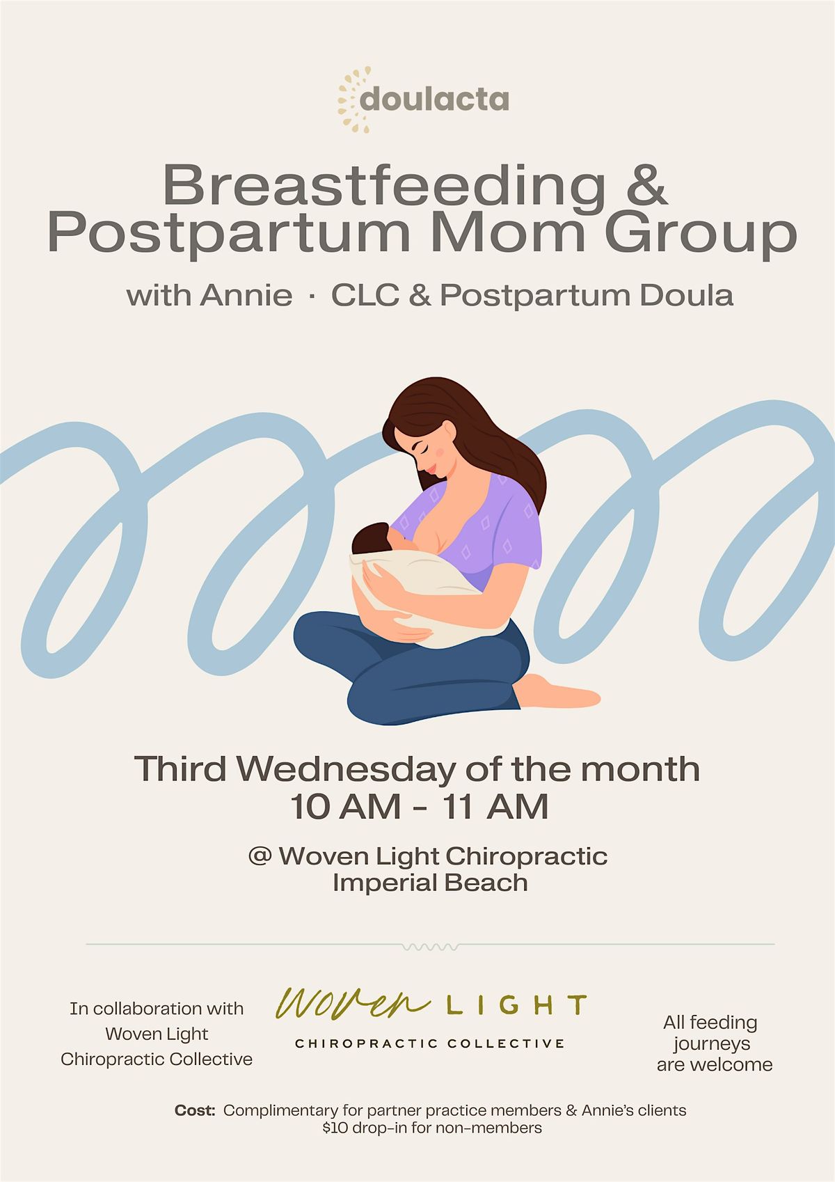 A relaxed, supportive postpartum group for new moms and parents with babies, led by Annie, a certified lactation counselor and certified postpartum doula (and mom).