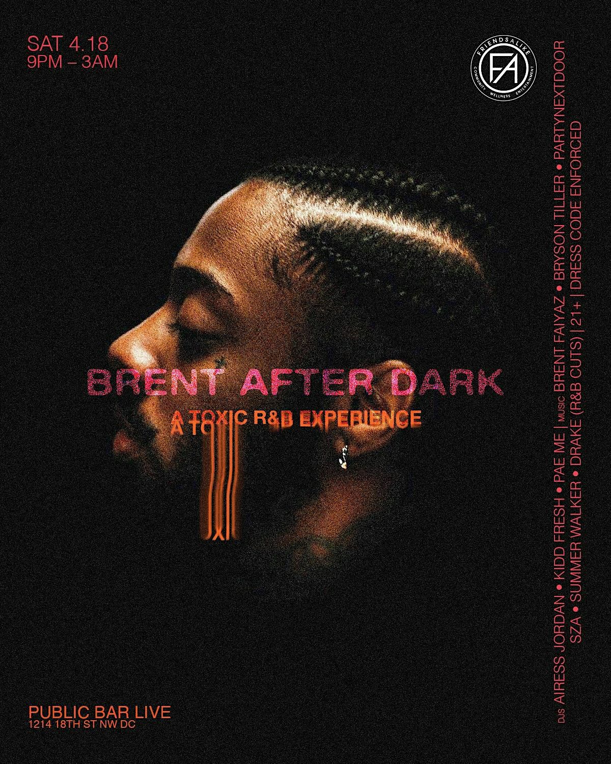 A late-night R&B experience inspired by Brent Faiyaz—sing-alongs, toxic vibes, and a room full of people who know every word.