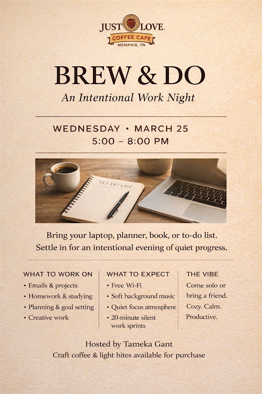 Brew&Do is an intentional work night designed for focused productivity in a calm,welcoming atmosphere. Whether you're tackling emails,planning your next move, studying, reading, or building something creative, this is your space to get it done.