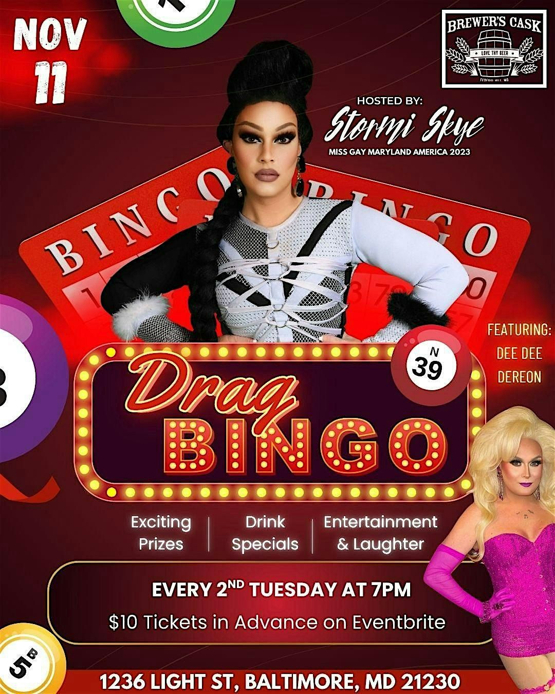 Get ready for a fabulous night of bingo with a fierce twist! Hosted by Miss Gay Maryland 2023, Stormi Skye, this isn’t your grandma’s bingo — it’s drag, drama, and dazzling prizes rolled into one unforgettable Tuesday night!
