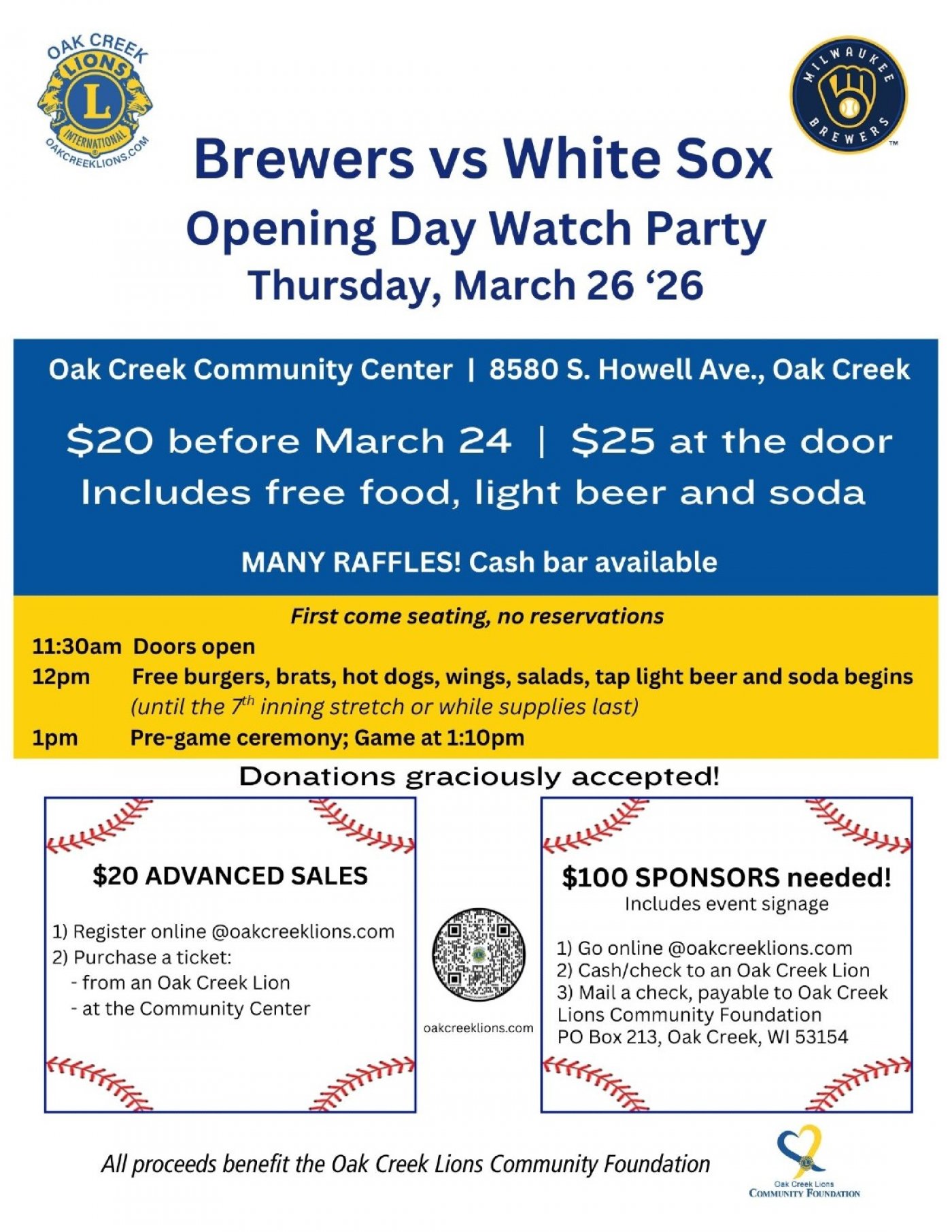 $20 admission in advance / $25 at the door. Includes free light beer, soda and food! Watch the Brewer game on big screens. Raffles will be available, too!