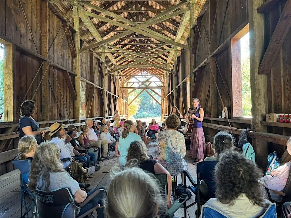 Felton Covered Bridge Park, ON the bridge itself! This is a magical place of in-between, where the sunlight and air flow freely, our bodies are covered from the rain, and our voices are held in beautiful acoustic resonances among the old growth redwood rafters.