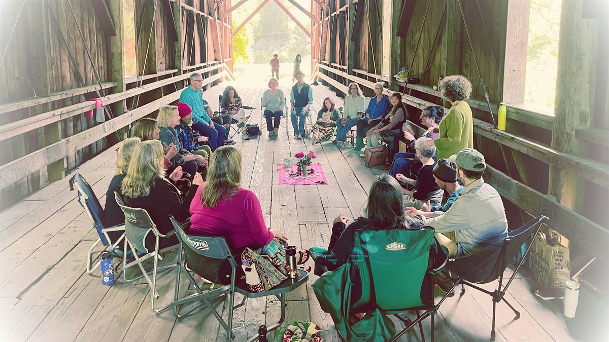 Felton Covered Bridge Park, ON the bridge itself! This is a magical place of in-between, where the sunlight and air flow freely, our bodies are covered from the rain, and our voices are held in beautiful acoustic resonances among the old growth redwood rafters.