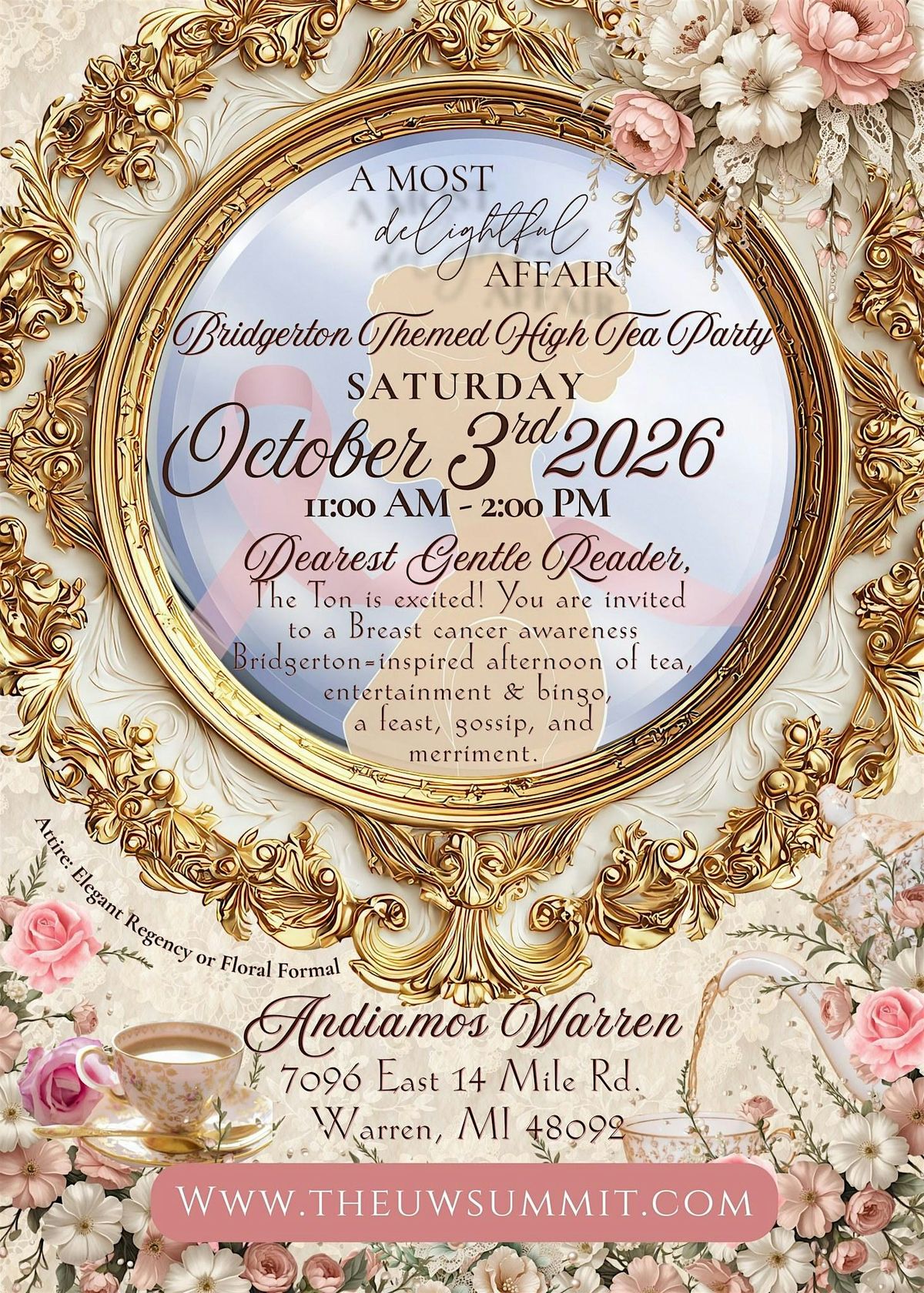 Welcome to the Bridgerton Breast Cancer Awareness High Tea Brunch! Join us at Andiamo Banquets & Catering - Warren on October 3, 2026 at 11:00 AM (Eastern Time) for a delightful event filled with scrumptious treats and a cause close to our hearts. Let's raise awareness and support together in a fancy and fun setting. Don't miss out on this opportunity to enjoy good company and make a difference. See you there!