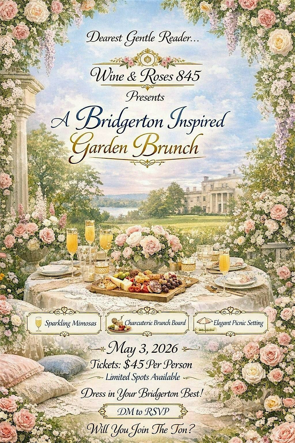 Step into a world of elegance at the Wine & Roses 845 Bridgerton Inspired Garden Brunch, a charming luxury picnic experience in the heart of the Hudson Valley. Join us on May 3, 2026 from 11AM–1PM at Kala Rock Park in Poughkeepsie, NY for a beautiful outdoor brunch surrounded by florals, vintage décor, and a dreamy garden picnic setting inspired by the romance of Bridgerton.