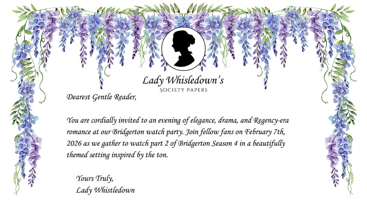 Expect period-inspired décor, themed refreshments, and plenty of swoon-worthy moments as we indulge in gossip, laughter, and the latest scandals from high society. Regency attire is encouraged but not required - come dressed to impress or simply come as you are.