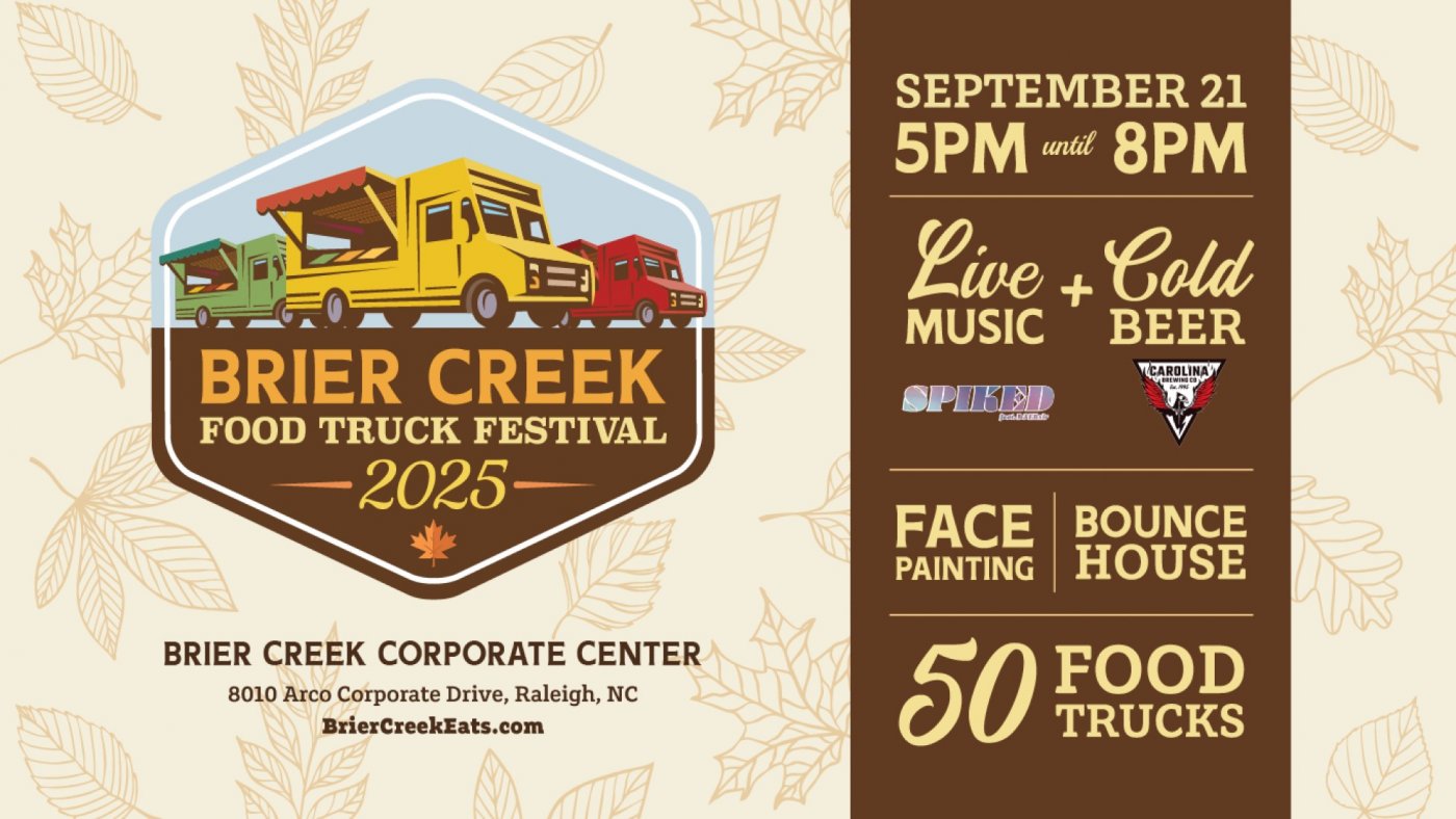 The Brier Creek Fall Food Truck Festival is BACK!Join us on Sunday September 21st from 5pm until 8pm and treat yourself to some of the area’s most popular food trucks serving up their delights.