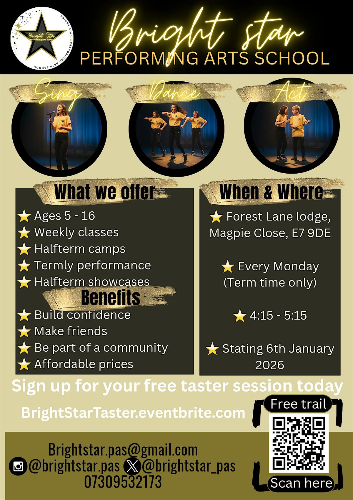 Ready to shine? Join us at Bright Star Performing Arts School for an awesome in-person experience! Whether you're into acting, dancing, or singing, this is the place to explore your talents and have a blast. Meet new friends, learn cool skills, and step into the spotlight. Don't miss out on the fun – come be a part of the Bright Star family and let your star shine bright!