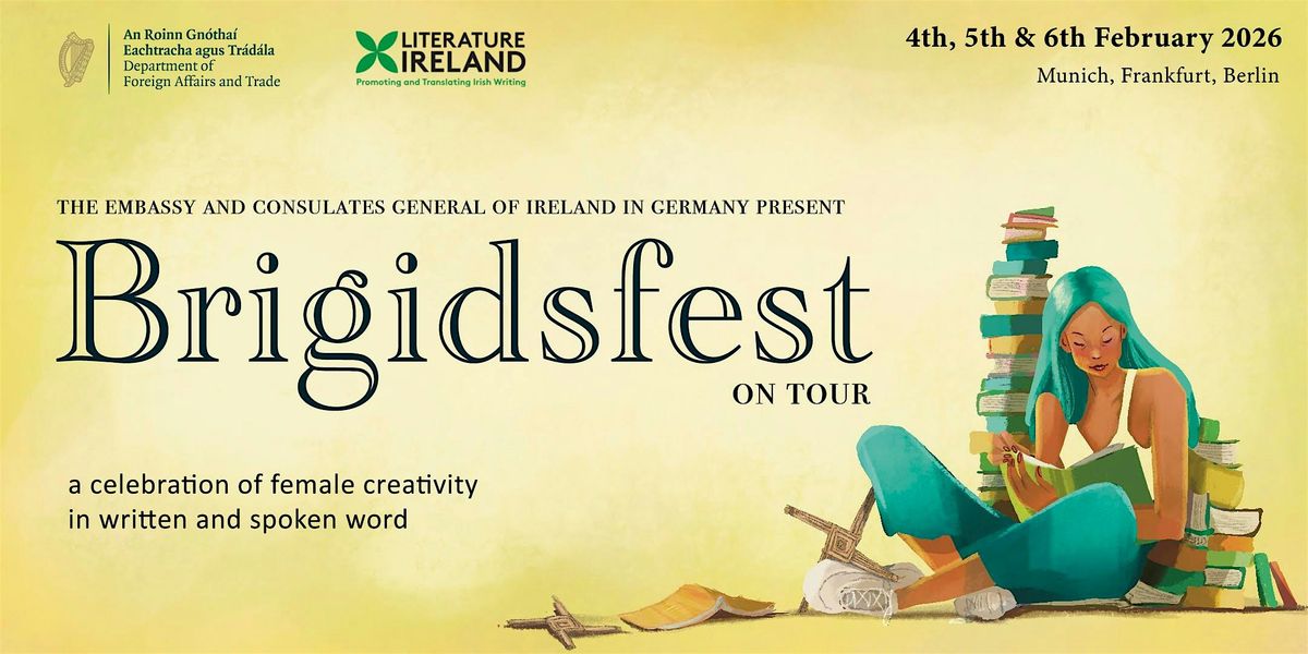 Brigidsfest, the popular Irish literary festival hosted yearly at the Embassy of Ireland in partnership with Literature Ireland has been growing since the inaugural Brigid meets Berlin in 2019. This year authors will go on tour! Starting from the Consulate General in Munich, writers will travel to the Consulate General in Frankfurt and finish in the Embassy in Berlin, presenting and discussing their new works.