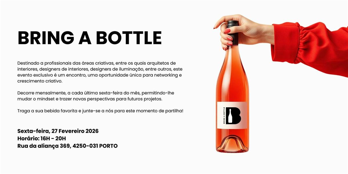 O "Bring a Bottle" é um evento exclusivo da Design-Minder, realizado na última sexta-feira de cada mês, das 16h às 20h. Pensado para profissionais das áreas criativas. Este encontro oferece uma oportunidade de networking e desenvolvimento criativo durante o horário de trabalho.