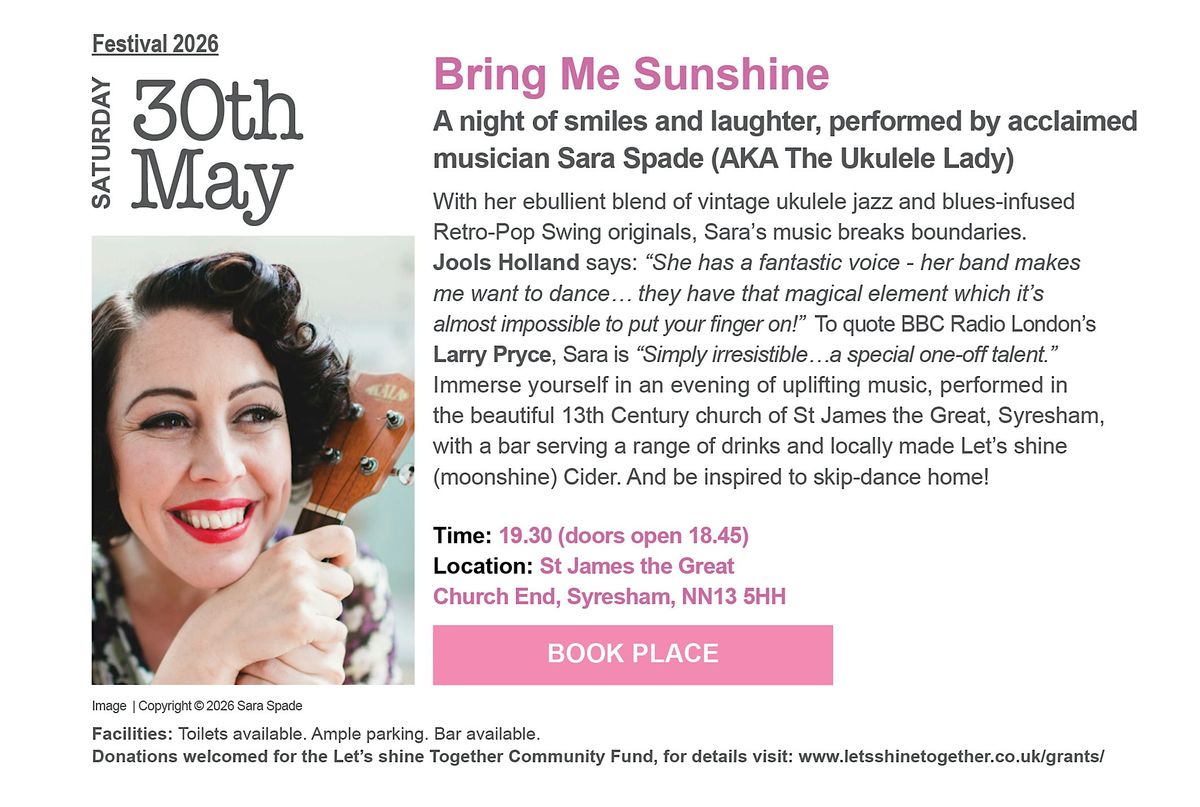 With her ebullient blend of vintage ukulele jazz and blues-infused Retro-Pop Swing originals, Sara's music breaks boundaries. Jools Holland says: "She has a fantastic voice - her band makes me want to dance... they have that magical element which it's almost impossible to put your finger on!" To quote BBC Radio London's Larry Pryce, Sara is "simply irresistible... a special one-off talent." Immerse yourself in an evening of uplifting music, performed in the beautiful 13th Century church of St James the Great, Syresham, with a bar serving a range of drinks nad locally made Let's shine (moonshine) Cider. And be inspired to skip-dance home!