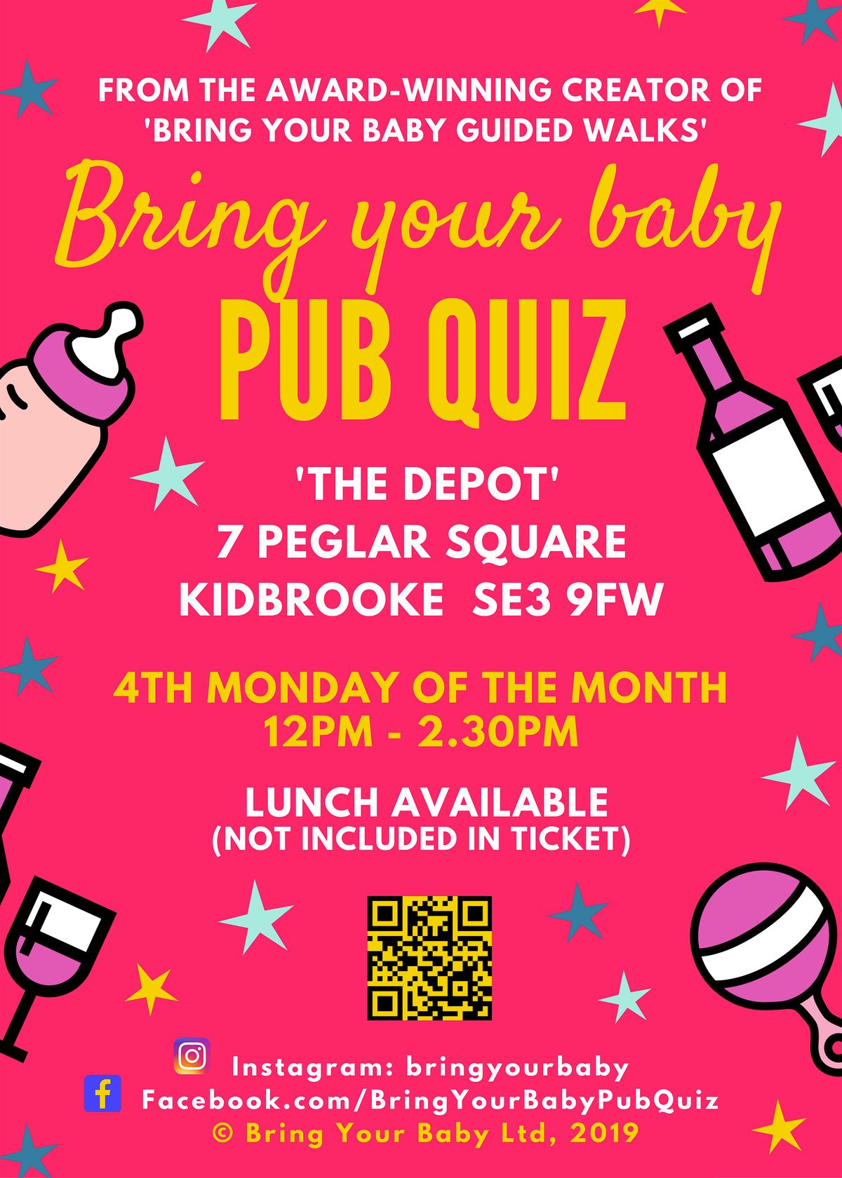 From the award-winning creator of ‘Bring Your Baby Guided London Walks’, ‘Bring Your Baby Pub Quizzes’ are fun, brain-stimulating daytime parent socials, which take place all over London, as well as Oxford, Bath, Epsom, St Albans, Harpenden and Hitchin.